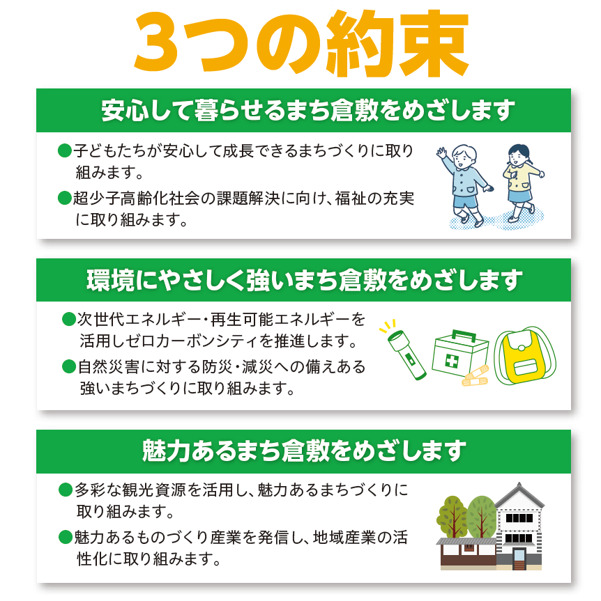 具体的には、3つの約束を重点的に取り組み、市民の皆様が誇りに思える倉敷市の創造に向け取り組んでいくとともに、皆様から身近に感じていただける、頼りにされる議員となるべく取り組んでまいります。
